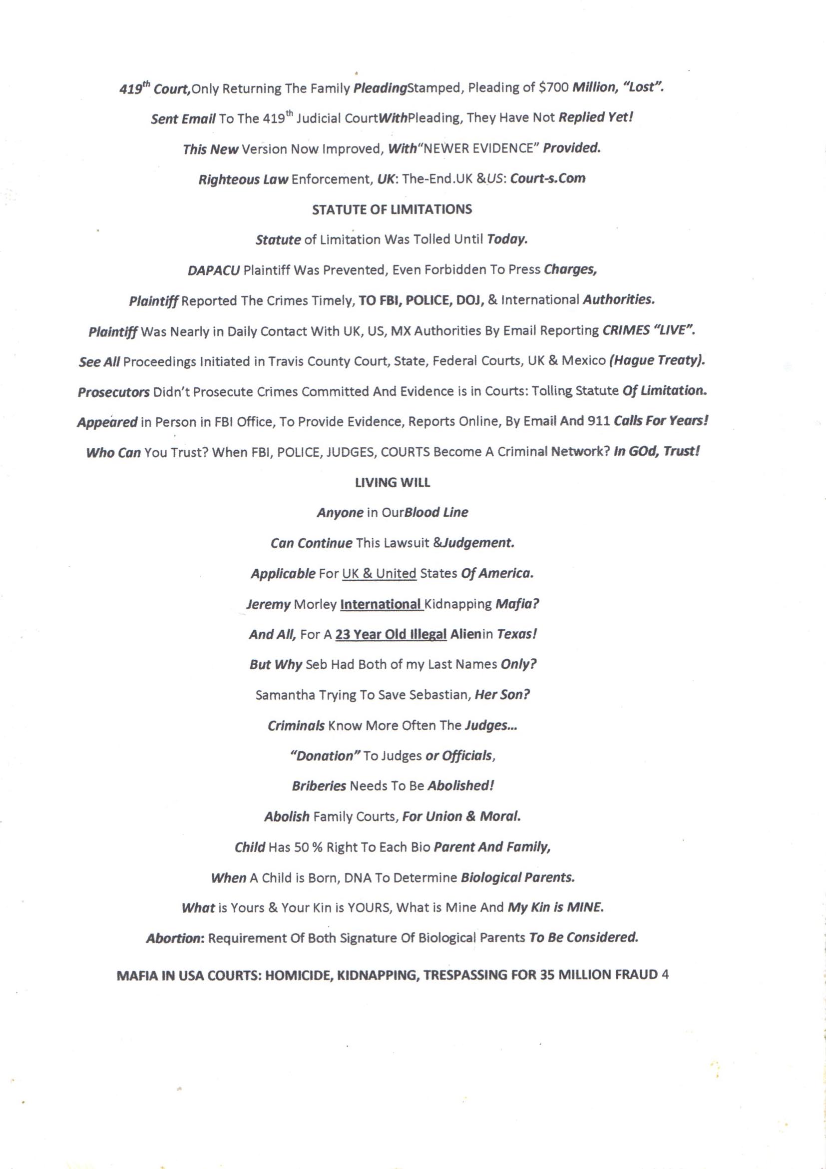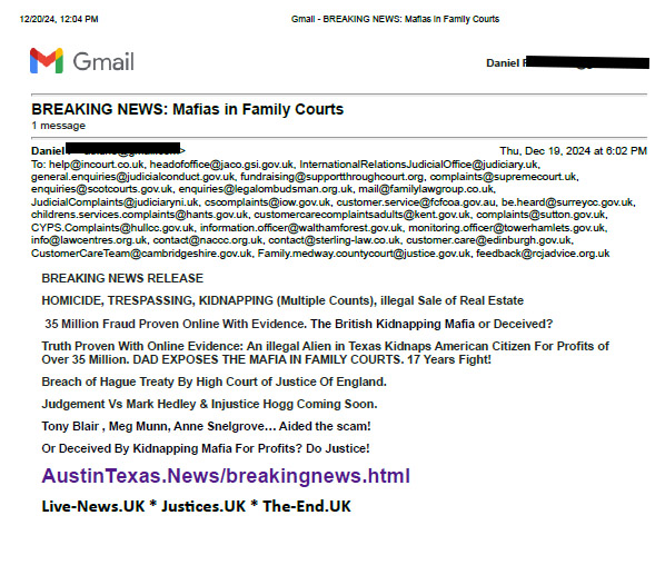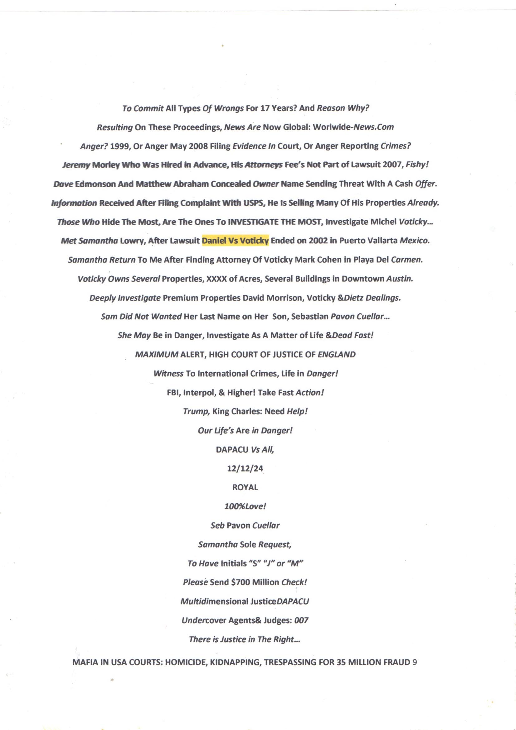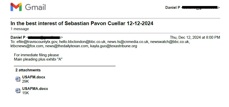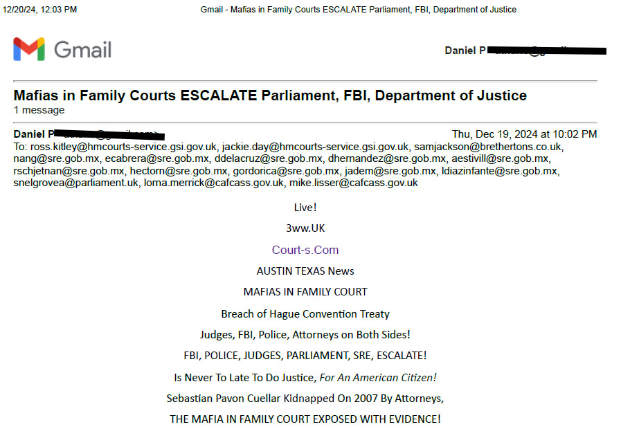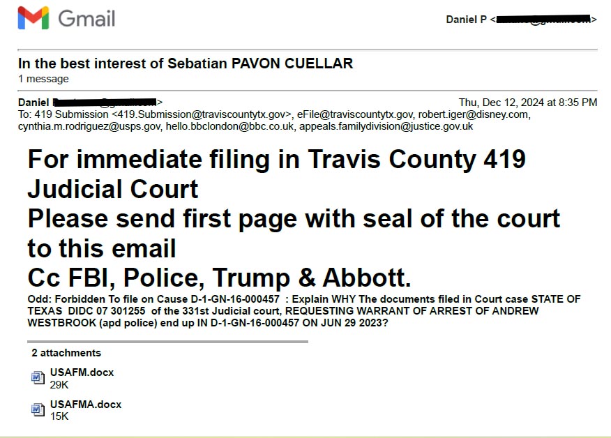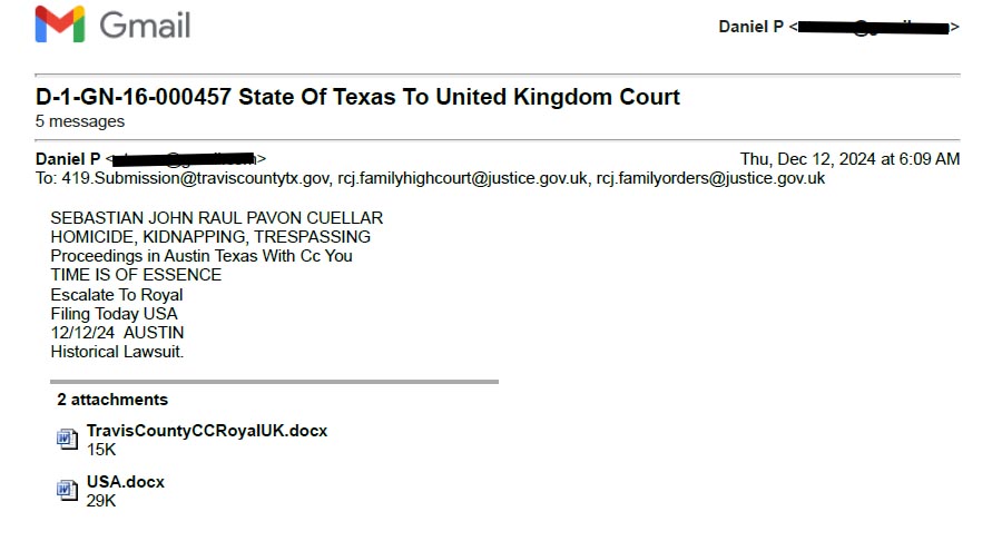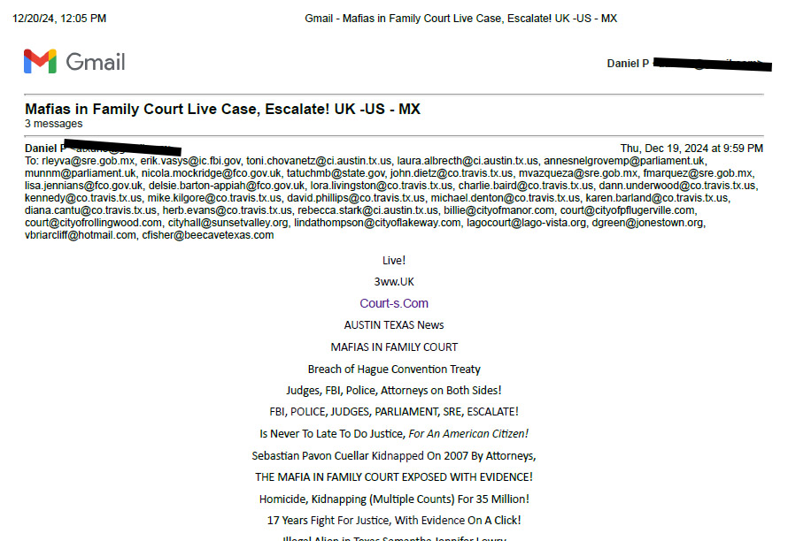 January 7, 2025 Sent To All Countries Signatory To Hague And All Courts in Travis County.