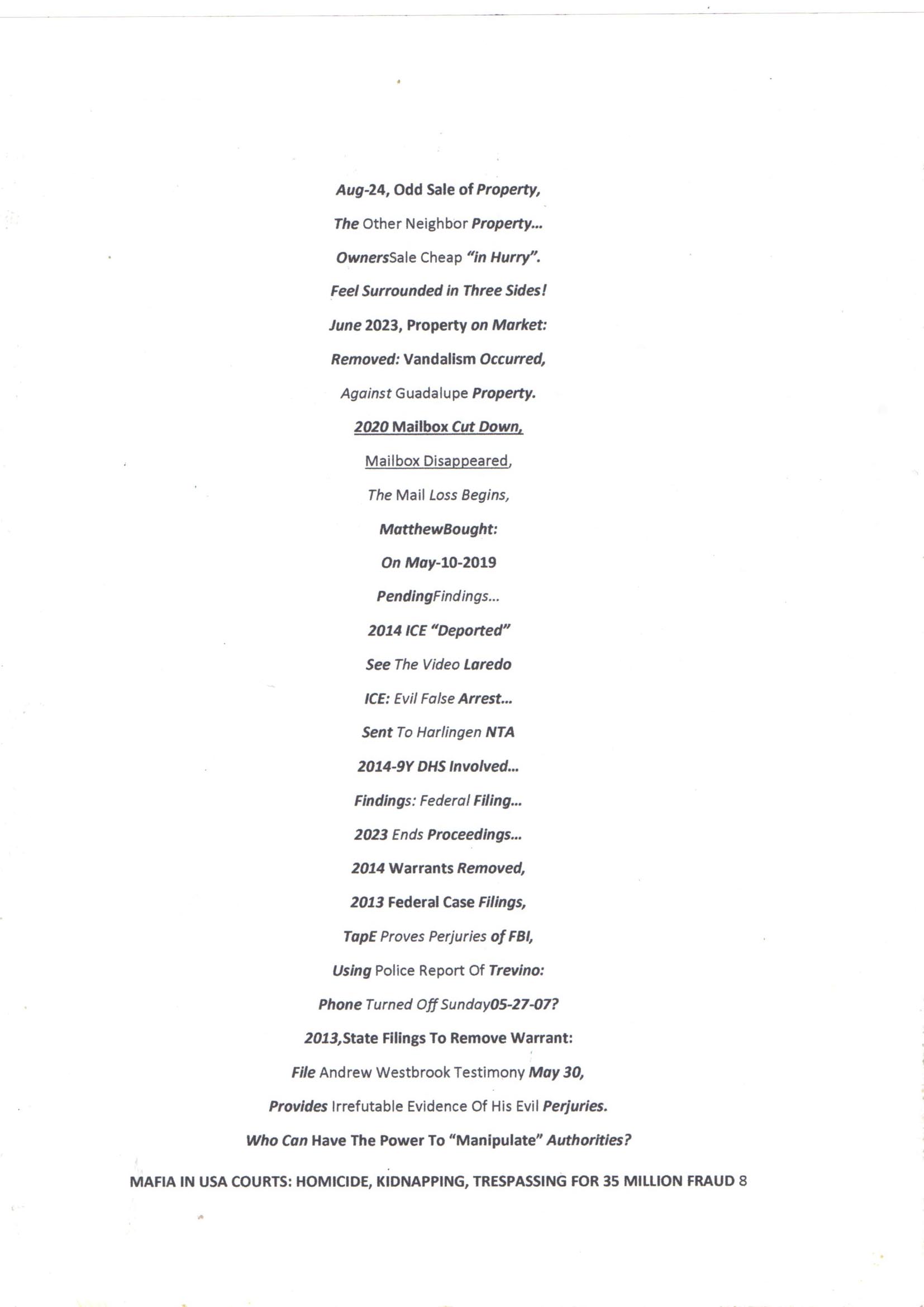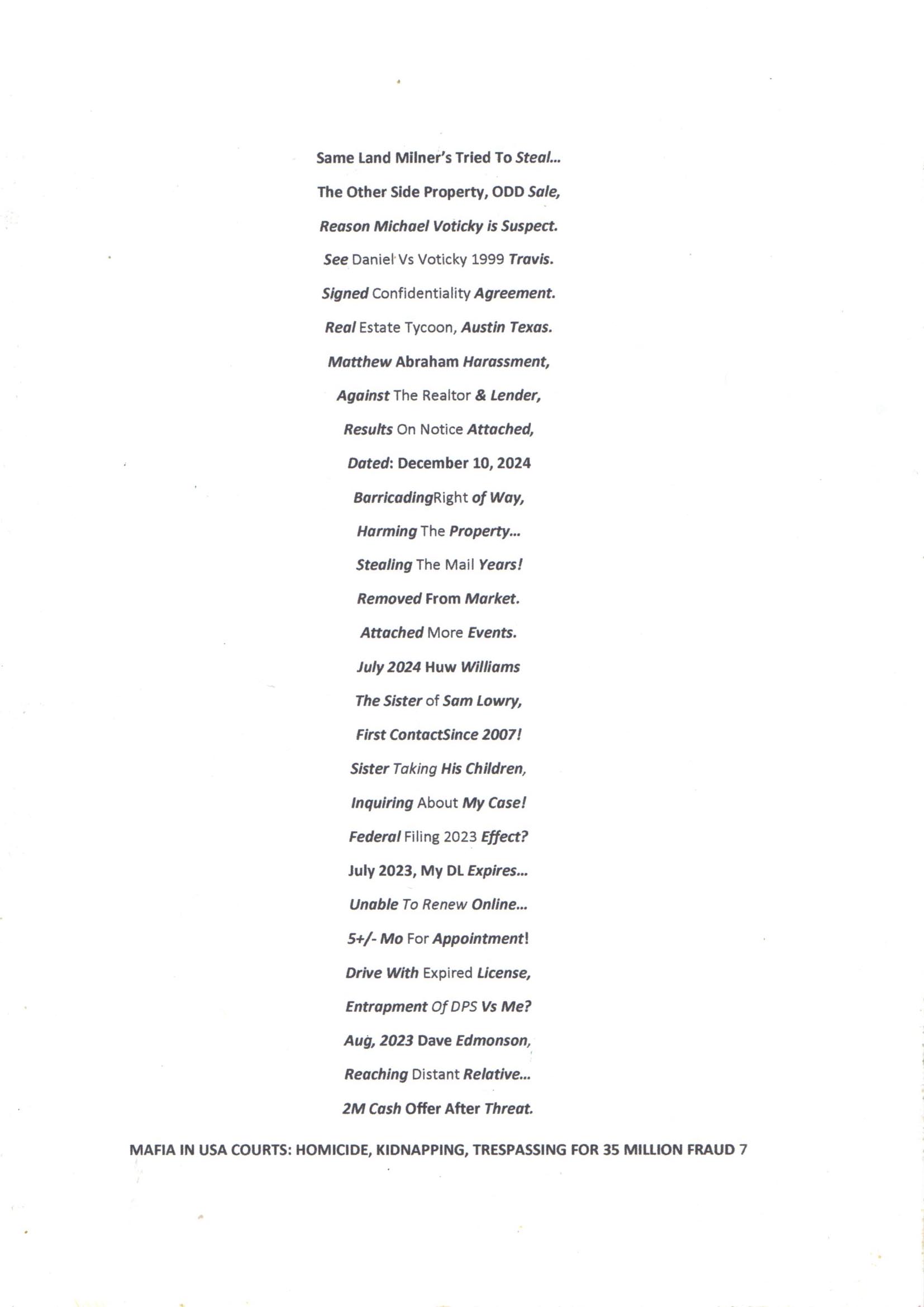 HOMICIDE, KIDNAPPING, TRESPASSING, FRAUD OF 35 Million.
