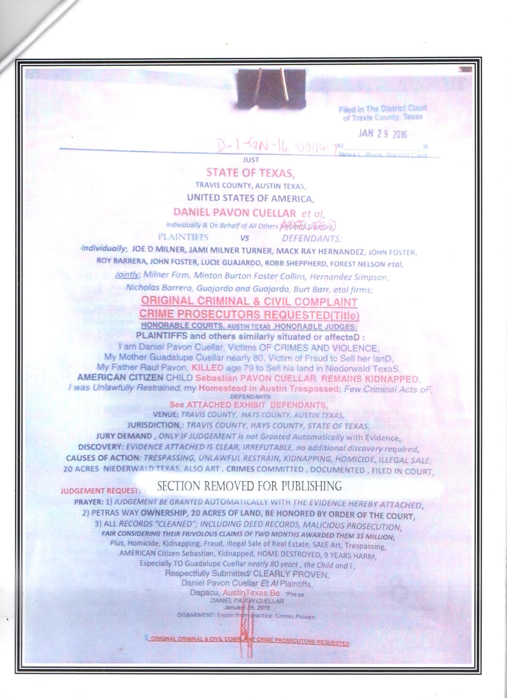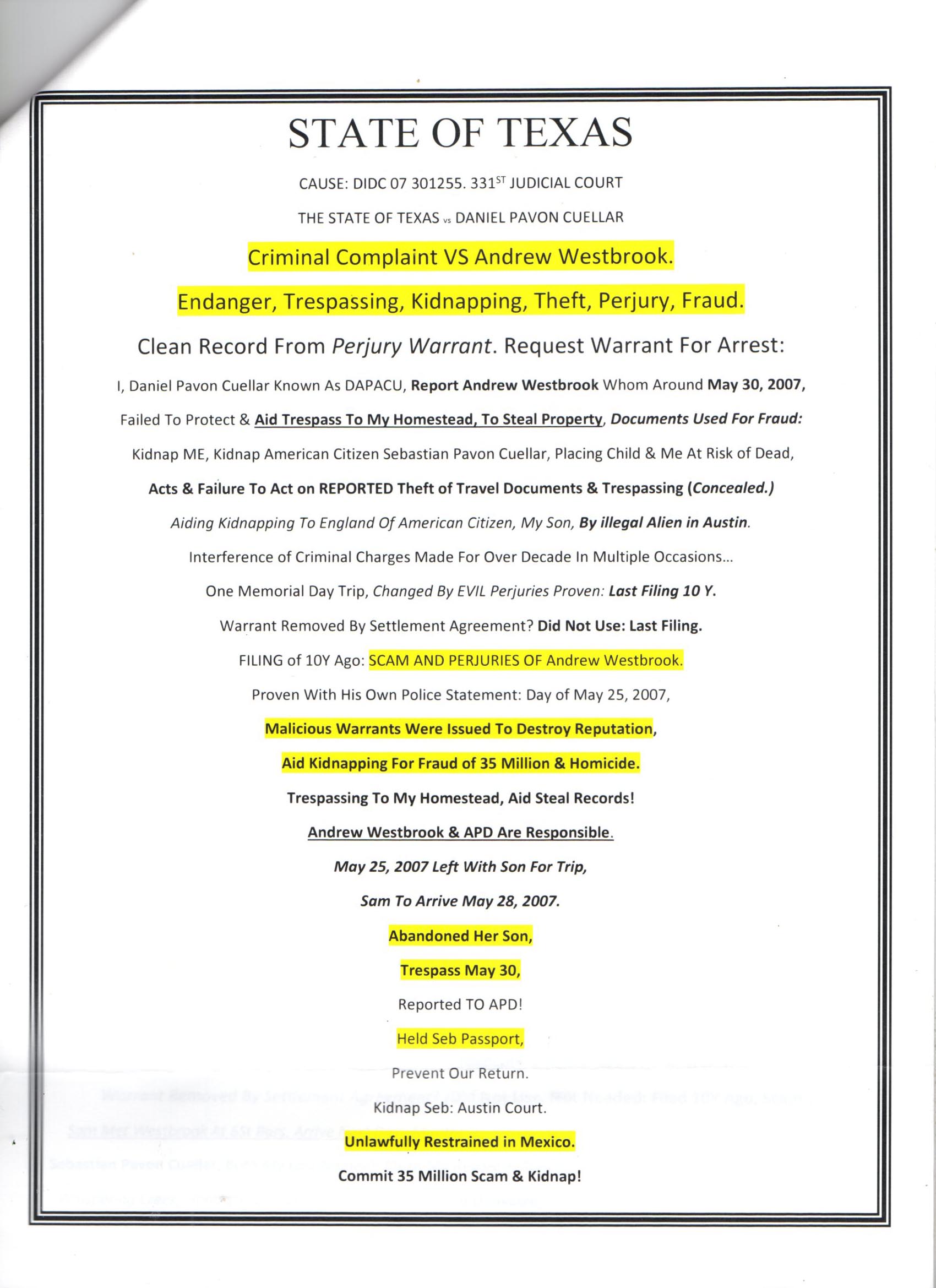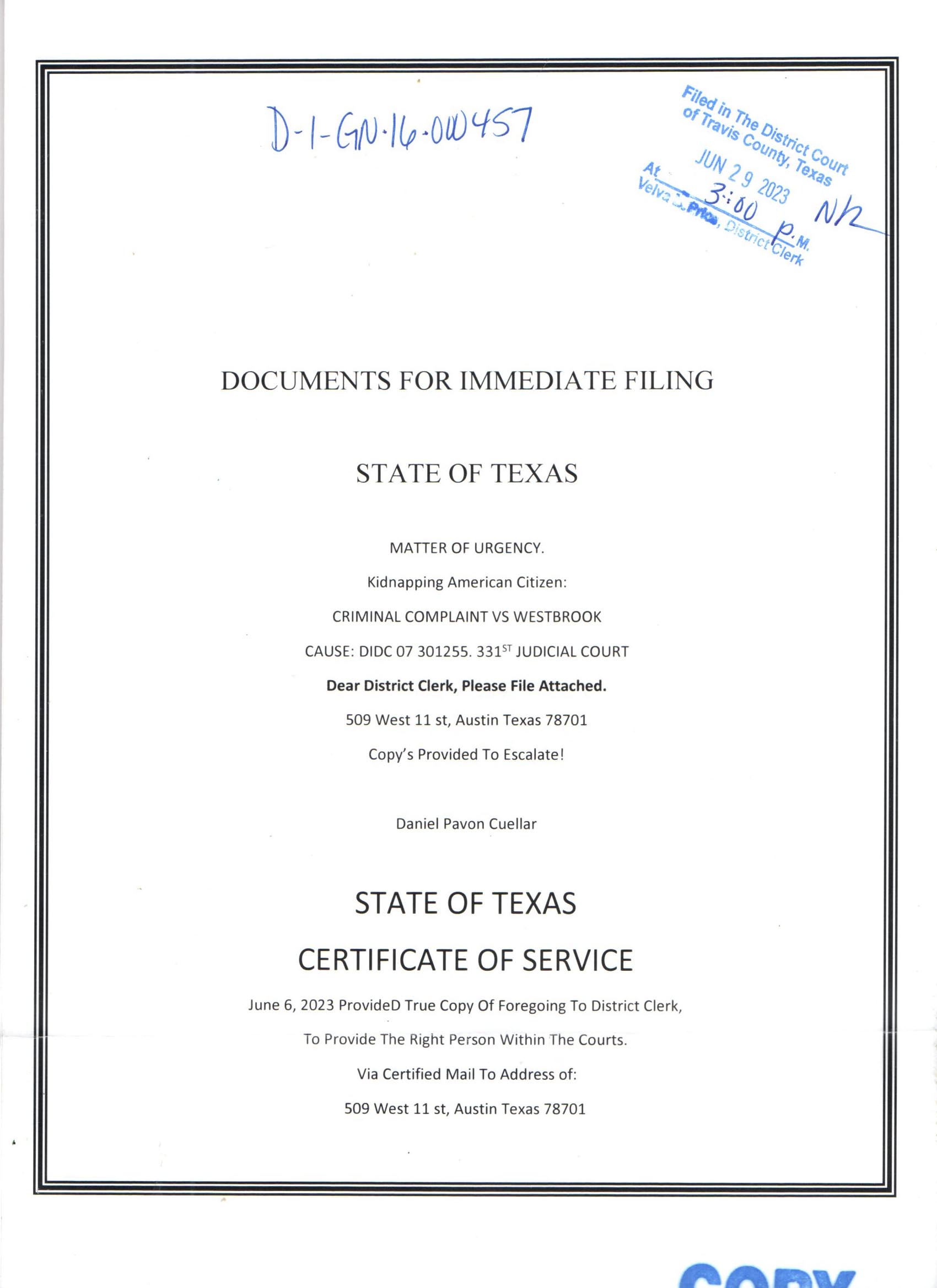 Following Records Sent For Filing in State Of Texas Criminal Court.