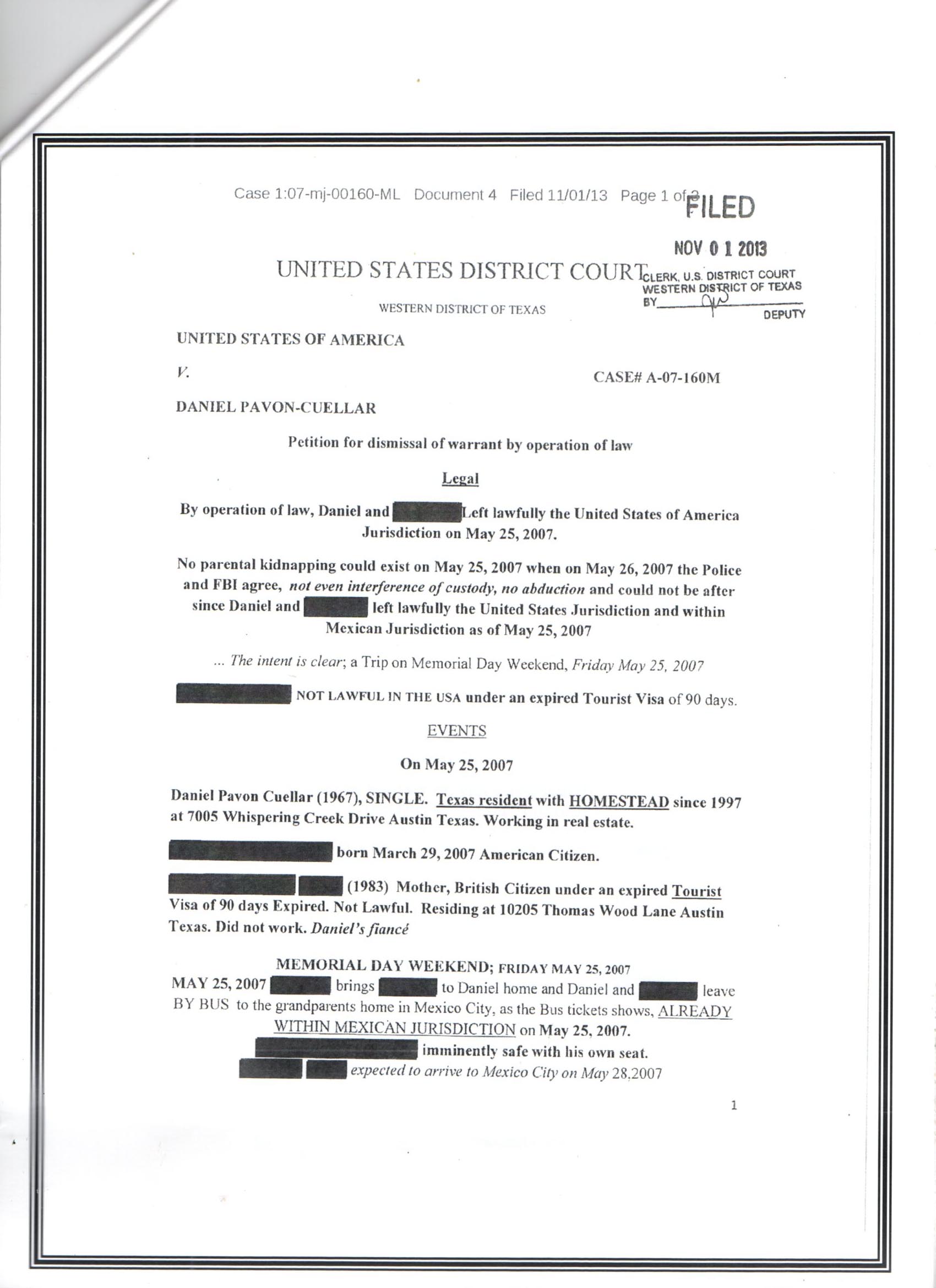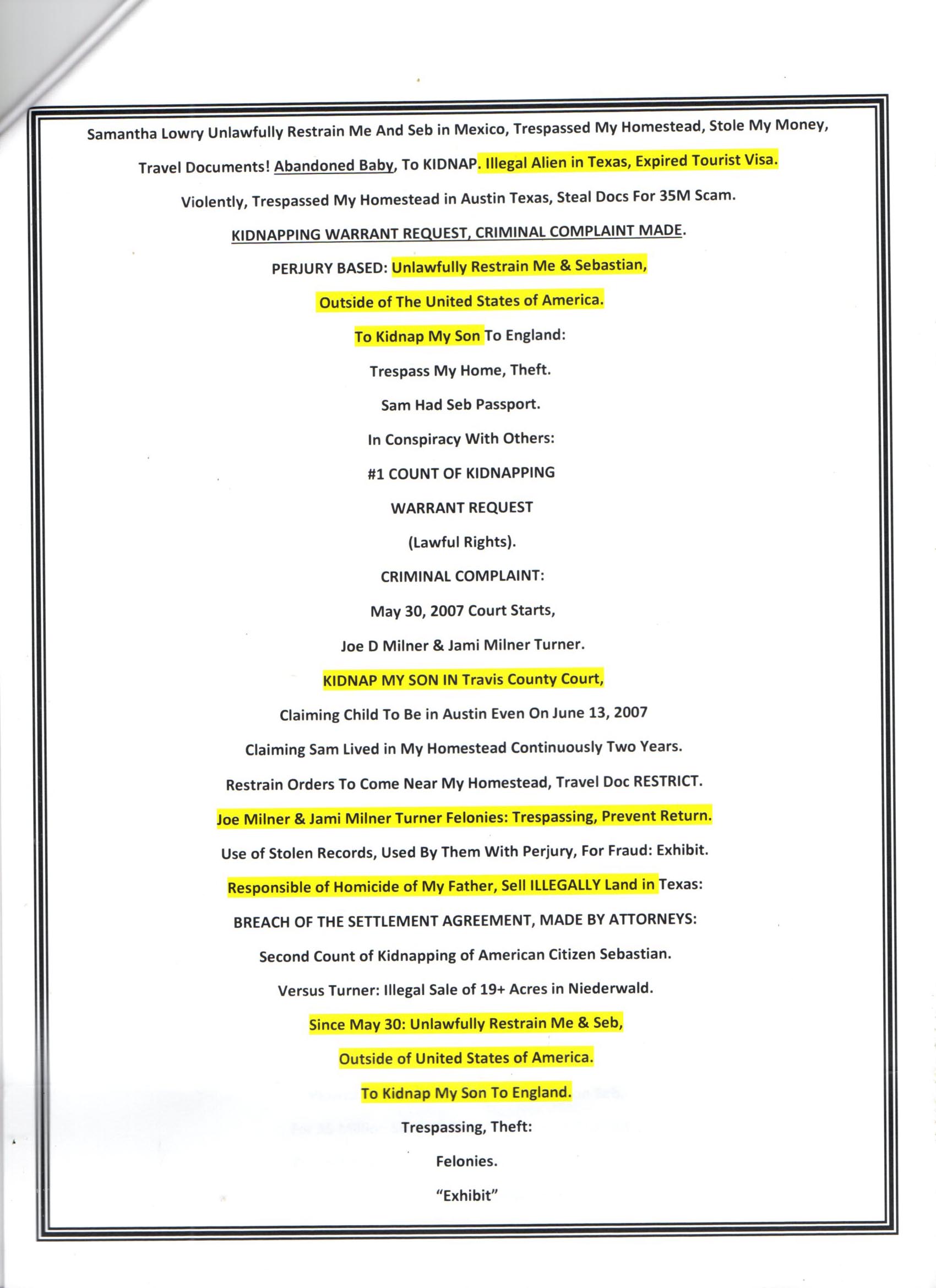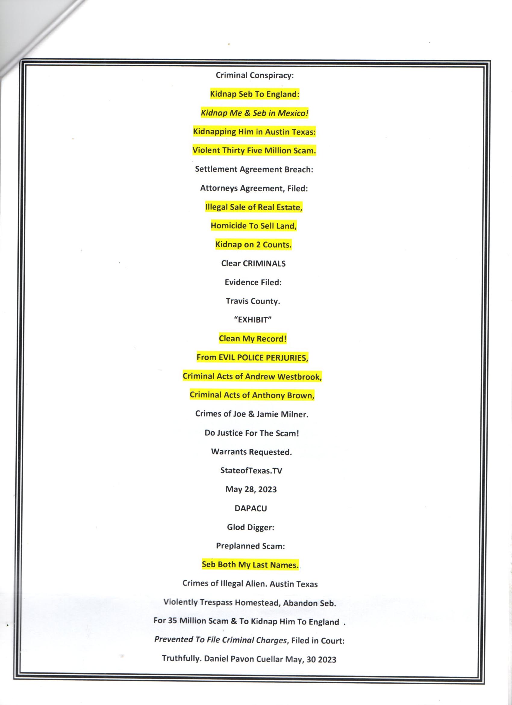 Following Records Sent For Filing in State Of Texas Criminal Court.