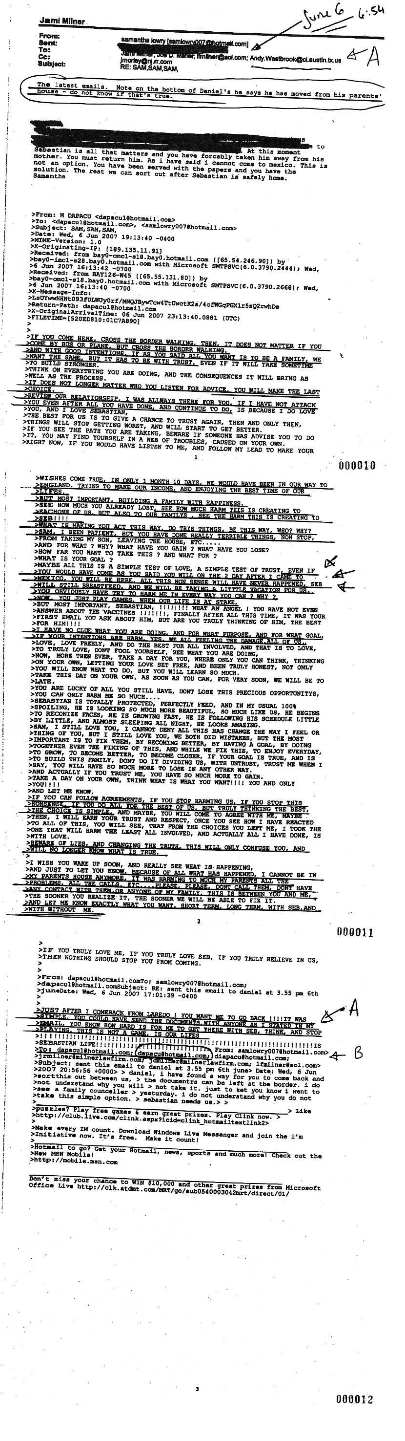 Illegal Alien Samantha Lowry in Texas, Kidnapping Texas Resident Daniel & American Citizen in Mexico For 35 Million. IRREFUTABLE EVIDENCE: FILED BY "THEM" IN TRAVIS COUNTY COURT, AUSTIN TEXAS AND PROVES: CRIMINAL CONSPIRACY TO KIDNAP DANIEL AND SEBASTIAN in Mexico, For 35 Million Fraud And: Jeremy Morley, Joe D Milner, Jami Milner Turner, Andrew Westbrook Are Guilty of: Two Counts of Kidnapping: Kidnapping Daniel And Kidnapping Sebastian. Criminal Conspiracy To KIDNAP DANIEL & SEBASTIAN IN MEXICO CHILD ENDANGERMENT, CHILD ABANDONMENT, CHILD EXPLOITATION, ATTEMPTED MURDER: LEAVE THEM WITHOUT MONEY IN A FOREIGN COUNTRY. Prevent By All Possible Means Their Return, “Play” Increasing Risk of Dead in Poverty. ROOT FOR THE FRAUD OF 35 MILLION And Proving ALL THEIR PERJURIES AND FALSE CLAIMS. Deceive Court, International Authorities, PROVES PERJURIES OF FBI AFFIDAVIT AND POLICE WARRANTS After 35 Million Scam, Samantha Finally Delivered The Travel Documents Under TREATY & Attorney Agreement EMPHASIS ADDED In The Following Email Thread: JUNE 6, 2007 (See Tony Blair, FBI, POLICE) Samantha: "...Daniel’s he says he has moved from his parents house...” (This Statement is Important, Since Targeted Victims Were Daniel Parents & Proving The PERJURIES OF MILNER’S in Lawsuit of 35 Million Scam) Samantha: “…the documents can be left at the border…” (Samantha Has The Travel Documents) Daniel: “JUST AFTER I COMEBACK FROM LAREDO! YOU WANT ME TO GO BACK !!!! IT WAS SIMPLE, YOU COULD HAVE SEND THE DOCUMENTS WITH ANYOINE AS I STATED IN MY EMAIL, YOU KNOW HOW HARD WAS FOR ME TO GET THERE WITH SEB, THINK, AND STOP PLAYING, THIS IS NOT A GAME, IS OUR LIFES” (it Was Agreed, Samantha Will Send Someone To Laredo And Provide Daniel With The Travel Documents To Enter The USA” Daniel: “…IF YOU WOULD HAVE COME AS YOU SAID YOU WILL ON THE 2 DAY AFTER I CAME TO MEXICO…” Daniel: “… I CANNOT BE IN MY PARENTS HOUSE ANYMORE, IT WAS HARMING TO MUCH MY PARENTS ALL THE PROBLEMS, ALL THE CALLS…" After The 35 Million Scam, Samantha Finally Delivered the Travel Documents! Kidnapping Sebastian To Continue With The Fraud. Sebastian May Have Died.